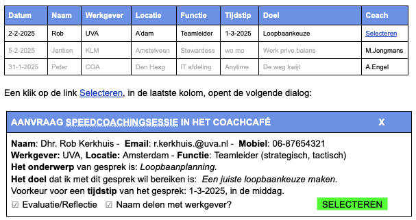 - Als coach kun je een aanmelding Selecteren en opvolgen. Hiermee verwerf je dan het eerste recht om, na het gesprek, bij een vervolgtraject, deze coachee verder te begeleiden.